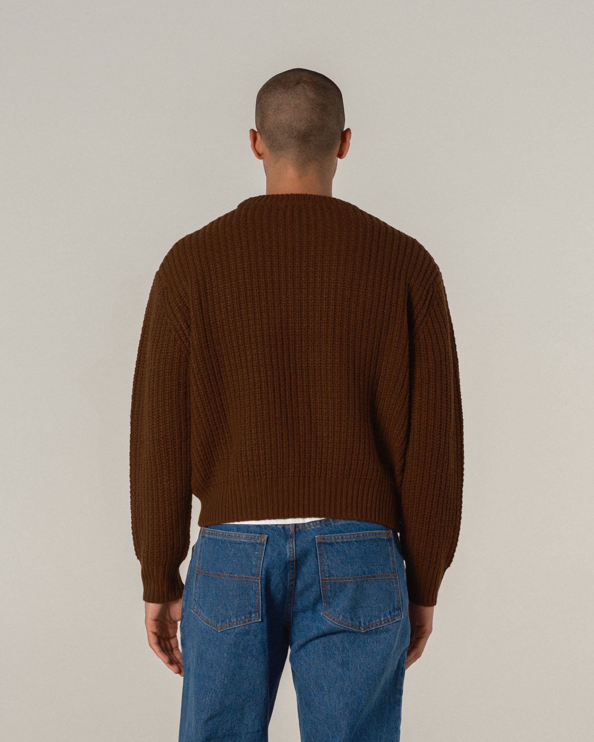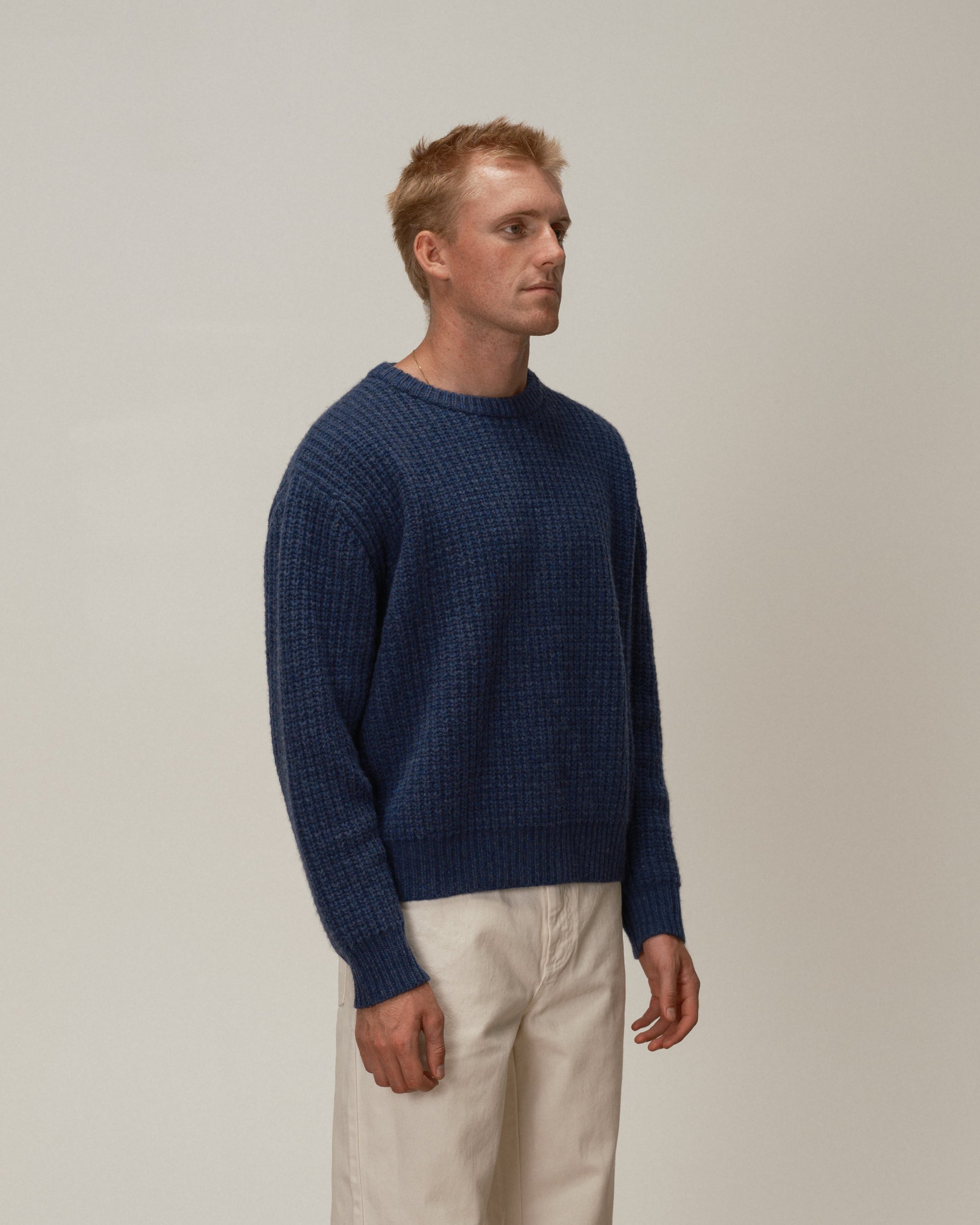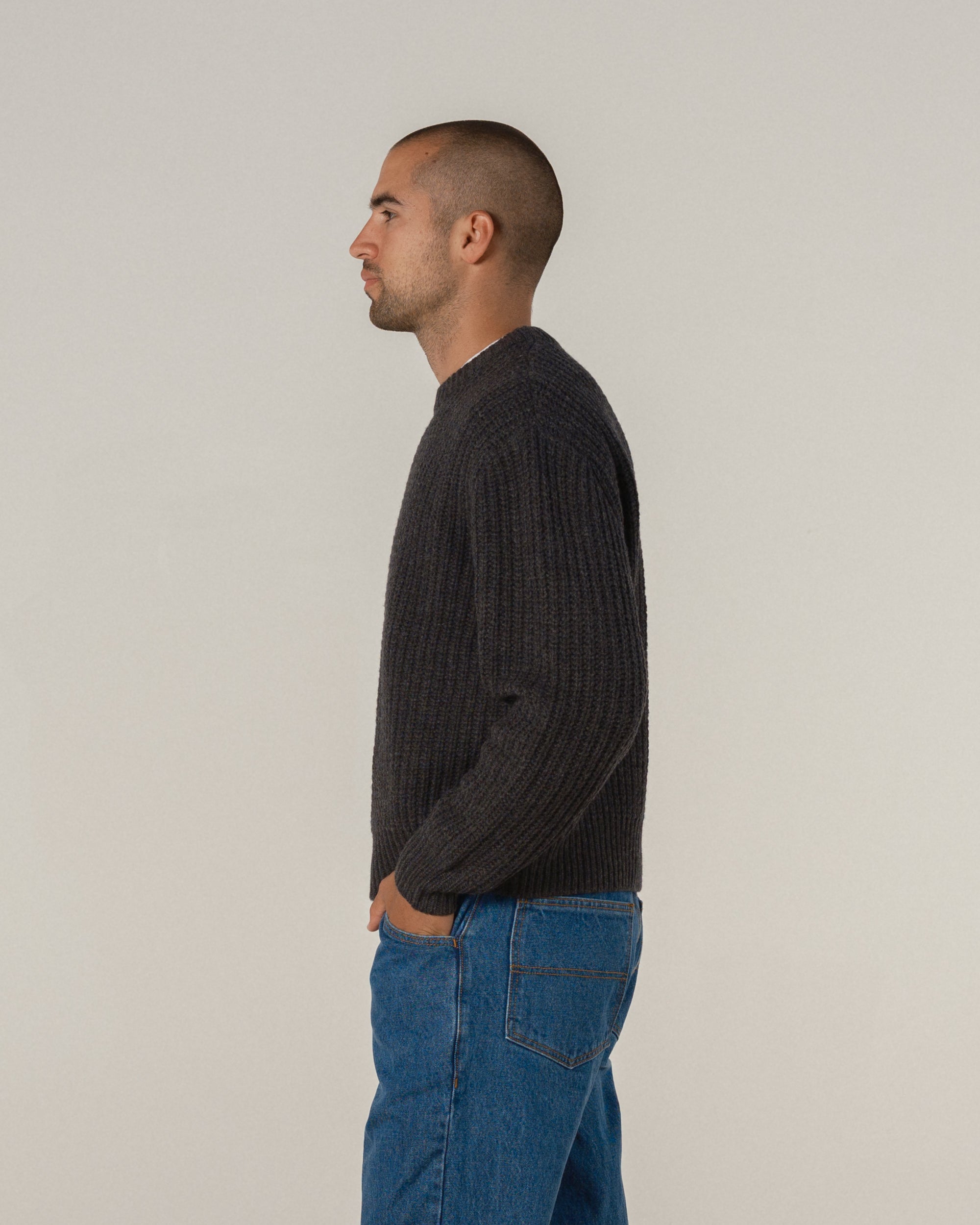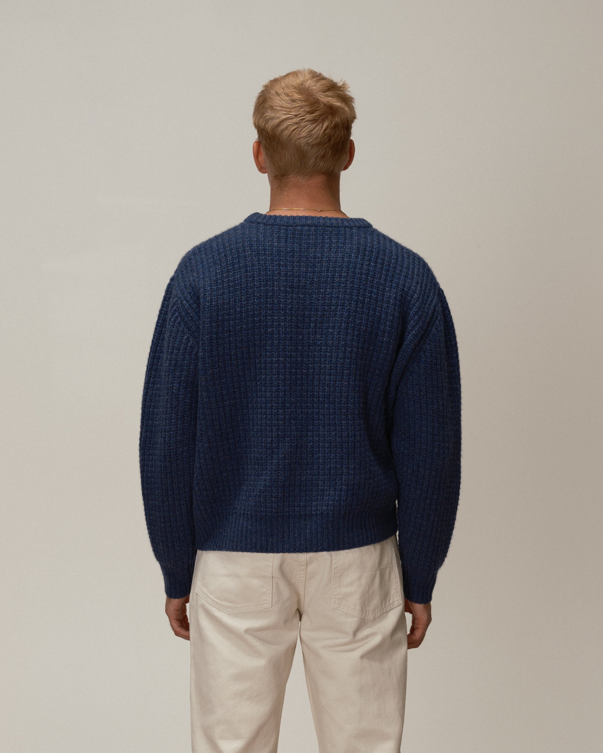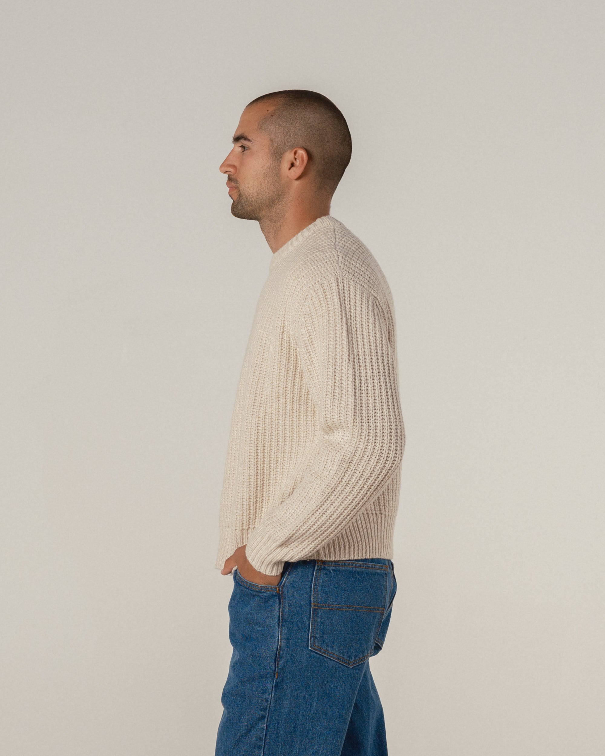 The Wool Fisherman Knit Sweater, the older sibling to our classic cotton fisherman knit. Featuring the same fit, this version is knitted with a 90/10 wool/cashmere blend yarn, meaning it has the longevity and quality of a wool sweater, but with enough cashmere to make sure it does not irritate your skin. These are perfect, if we do say so ourself.