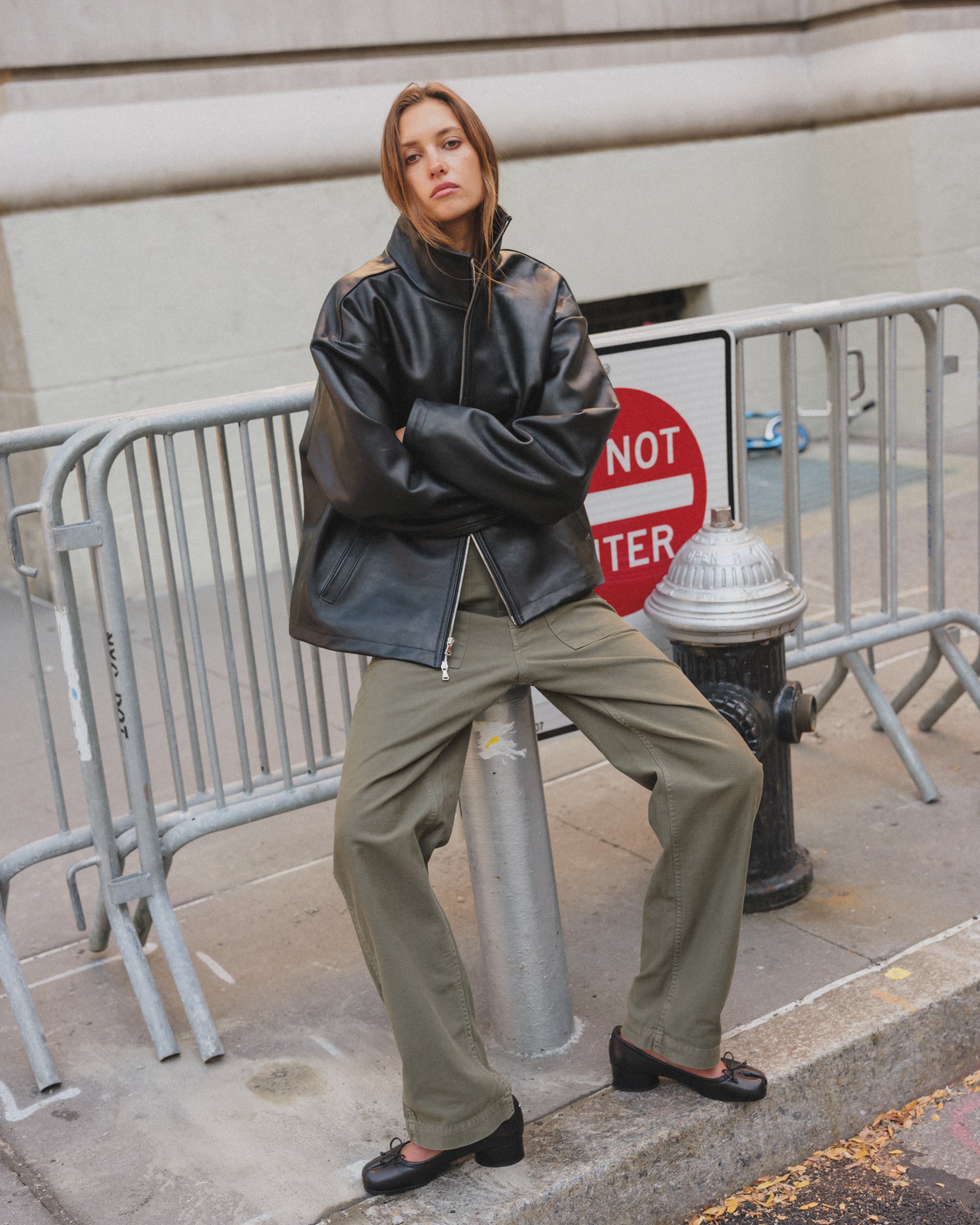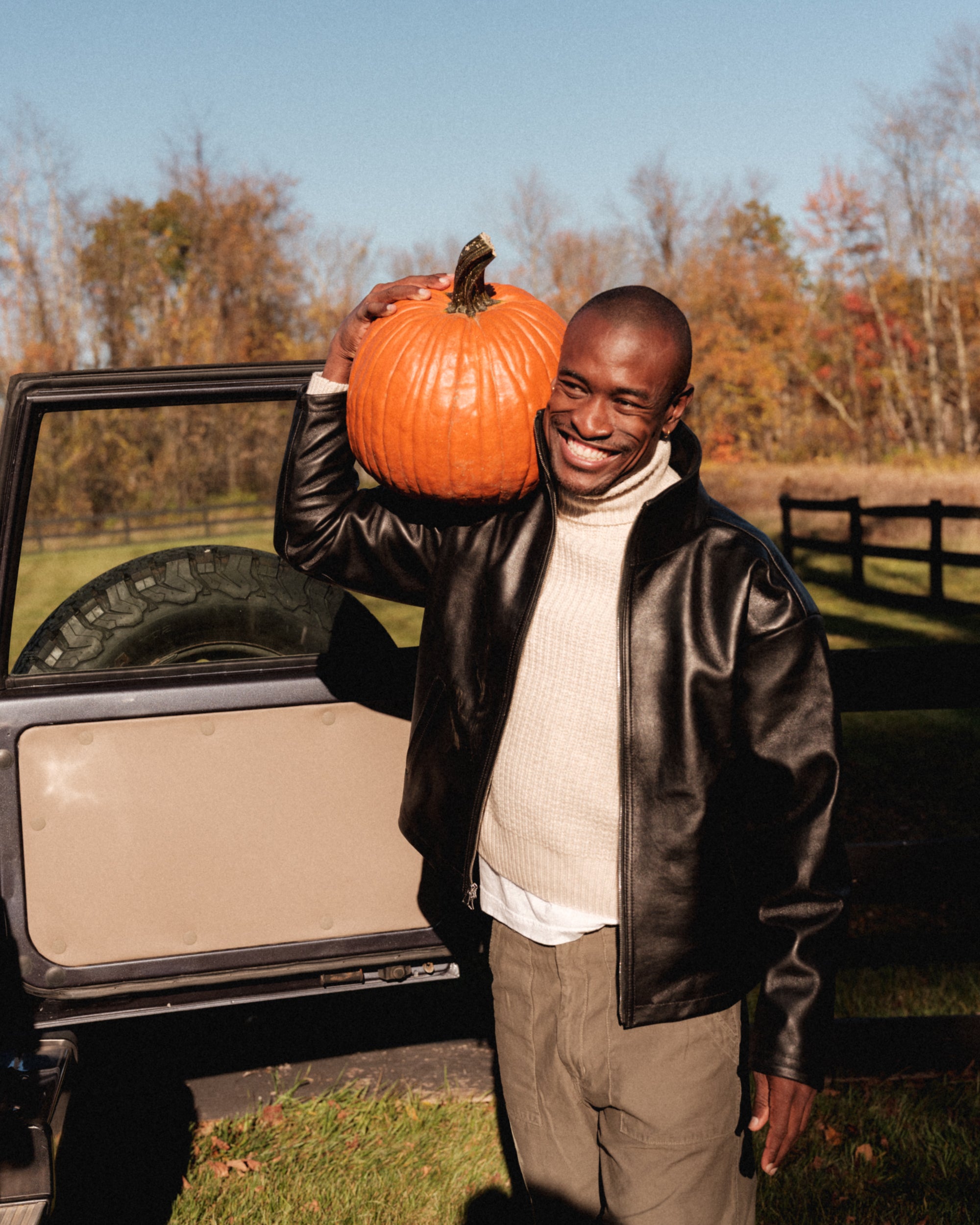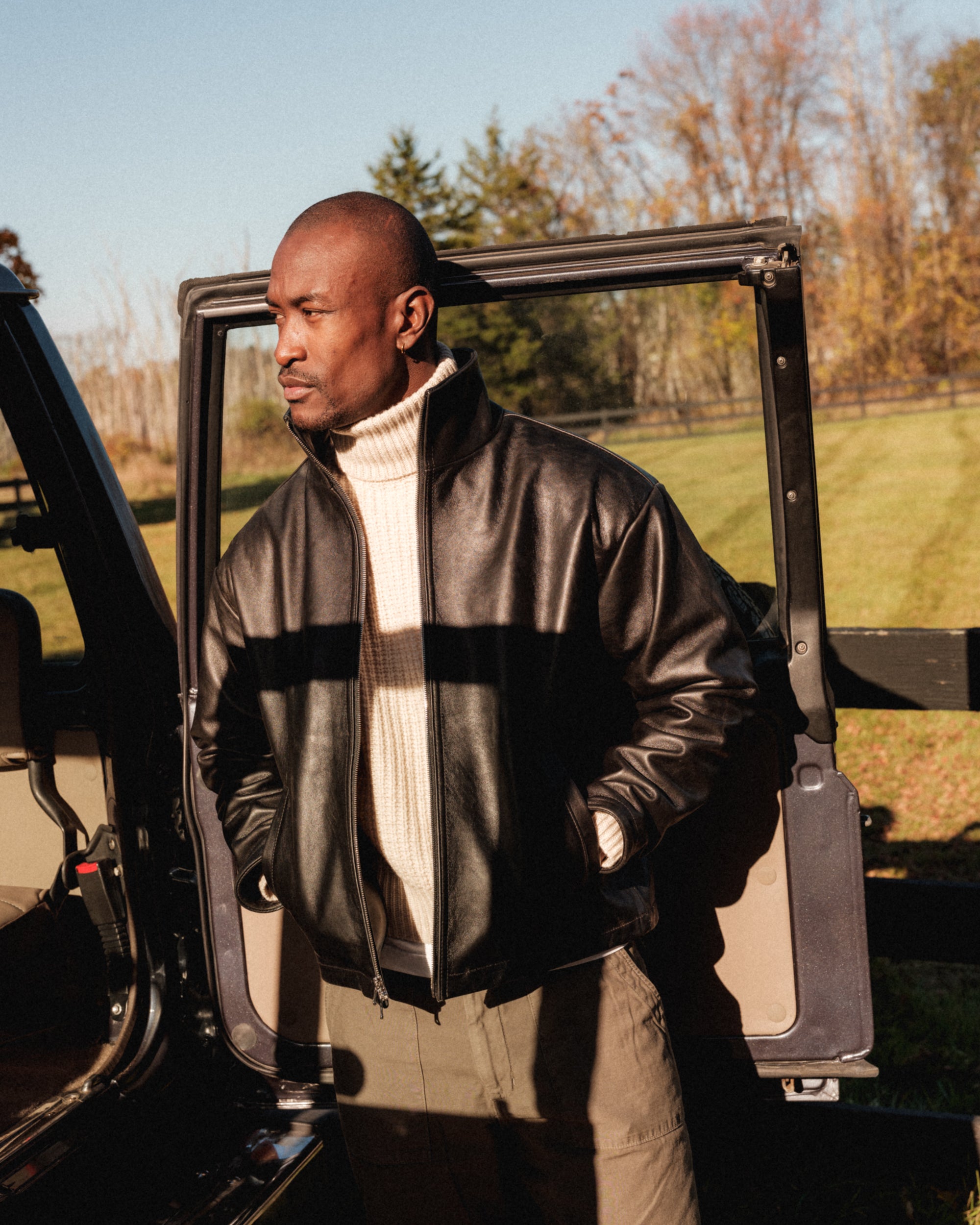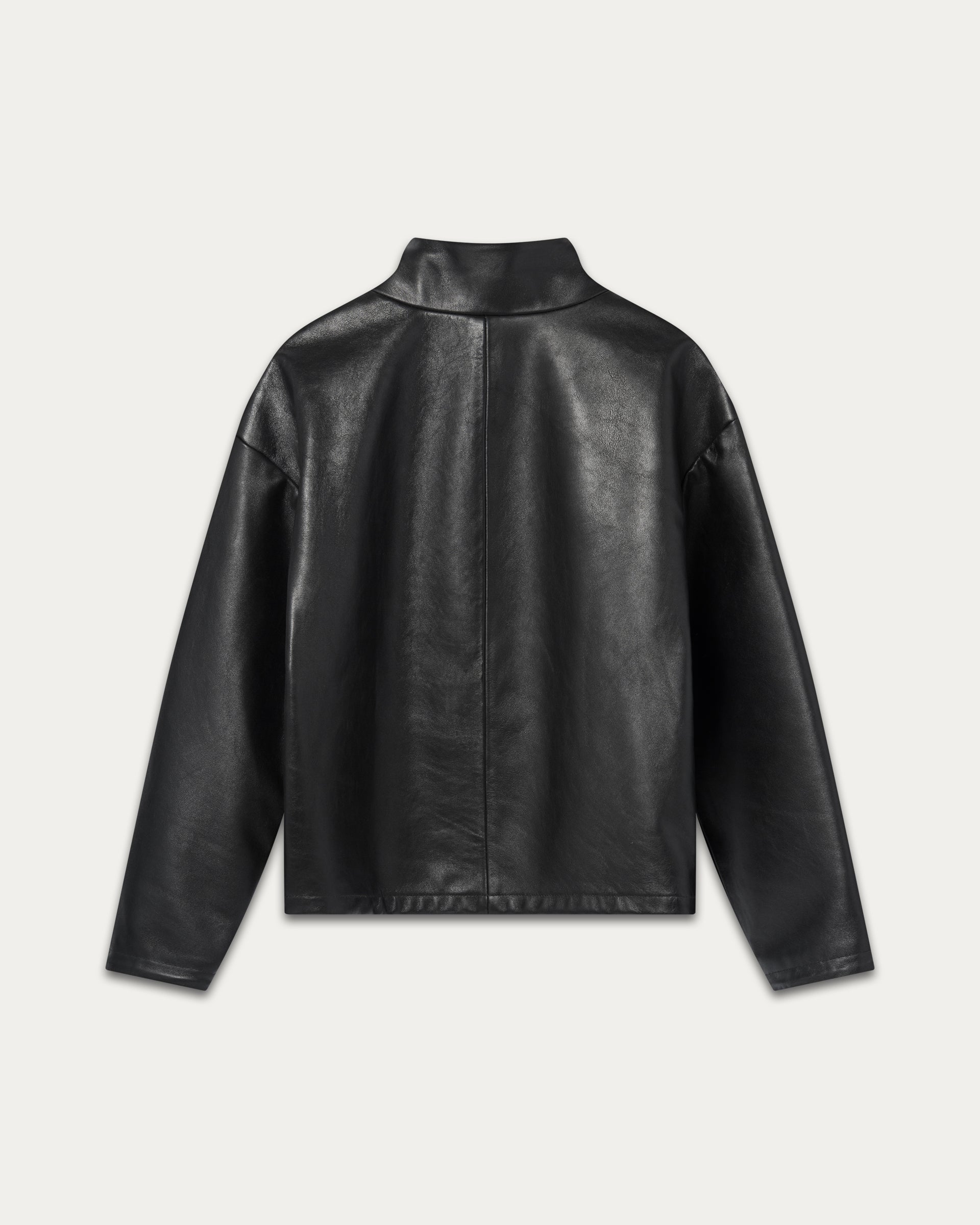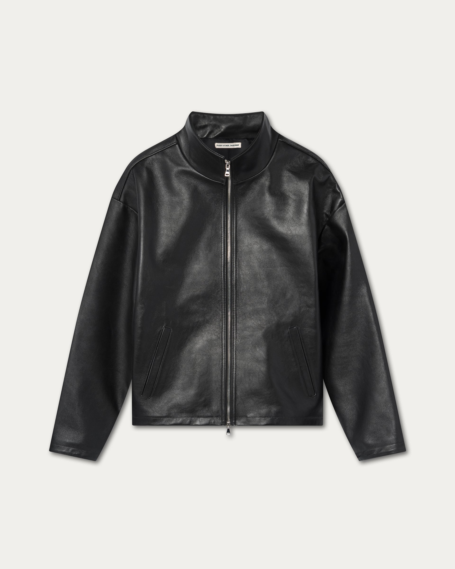 Our flagship jacket in fine grain, genuine leather. Made in USA from genuine cow leather and lined with a silky satin fabric. Features two outer welt pockets and an inside breast pocket. The raw hides come from Argentina and are treated in New York to achieve the rich black fine grain leather, then shipped to our factory in California to be made into the full garment. The is a show-stopping piece.