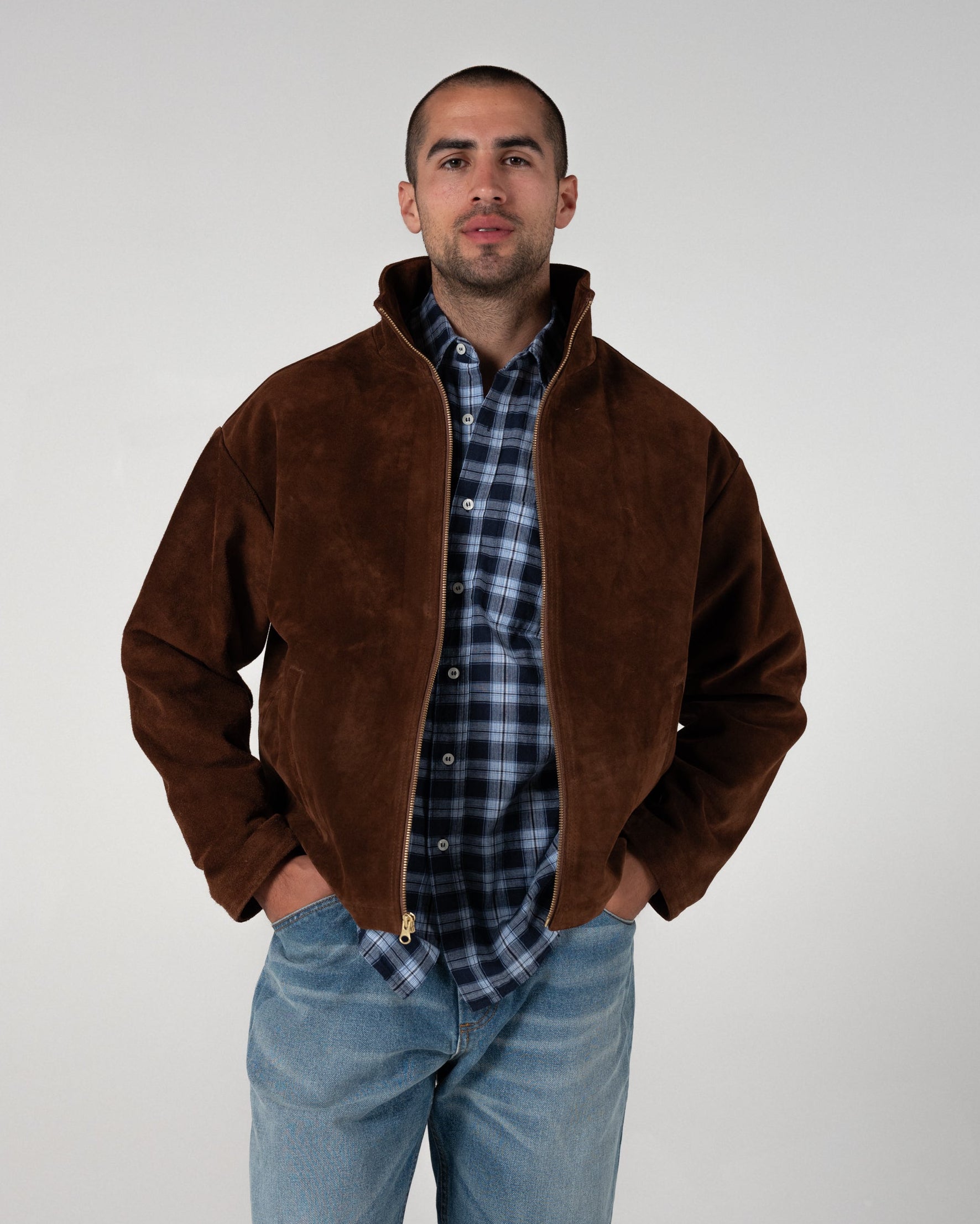 Our flagship jacket in ultra-luxe, genuine suede. Made in USA from genuine cow suede and lined with a silky satin fabric. Features two outer welt pockets and an inside breast pocket. The raw hides come from Argentina and are treated in New York to achieve the buttery dark brown suede, then shipped to our factory in California to be made into the full garment.