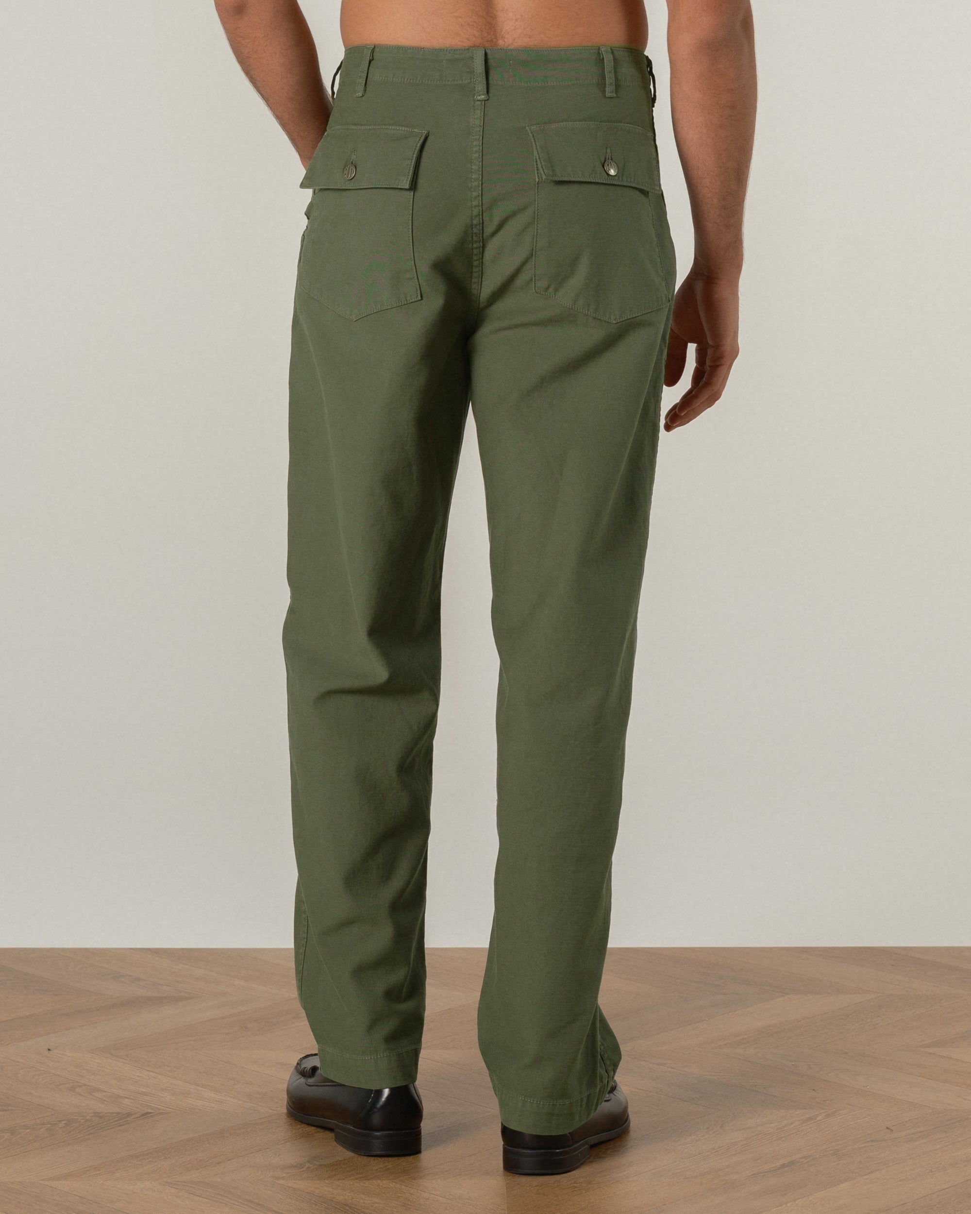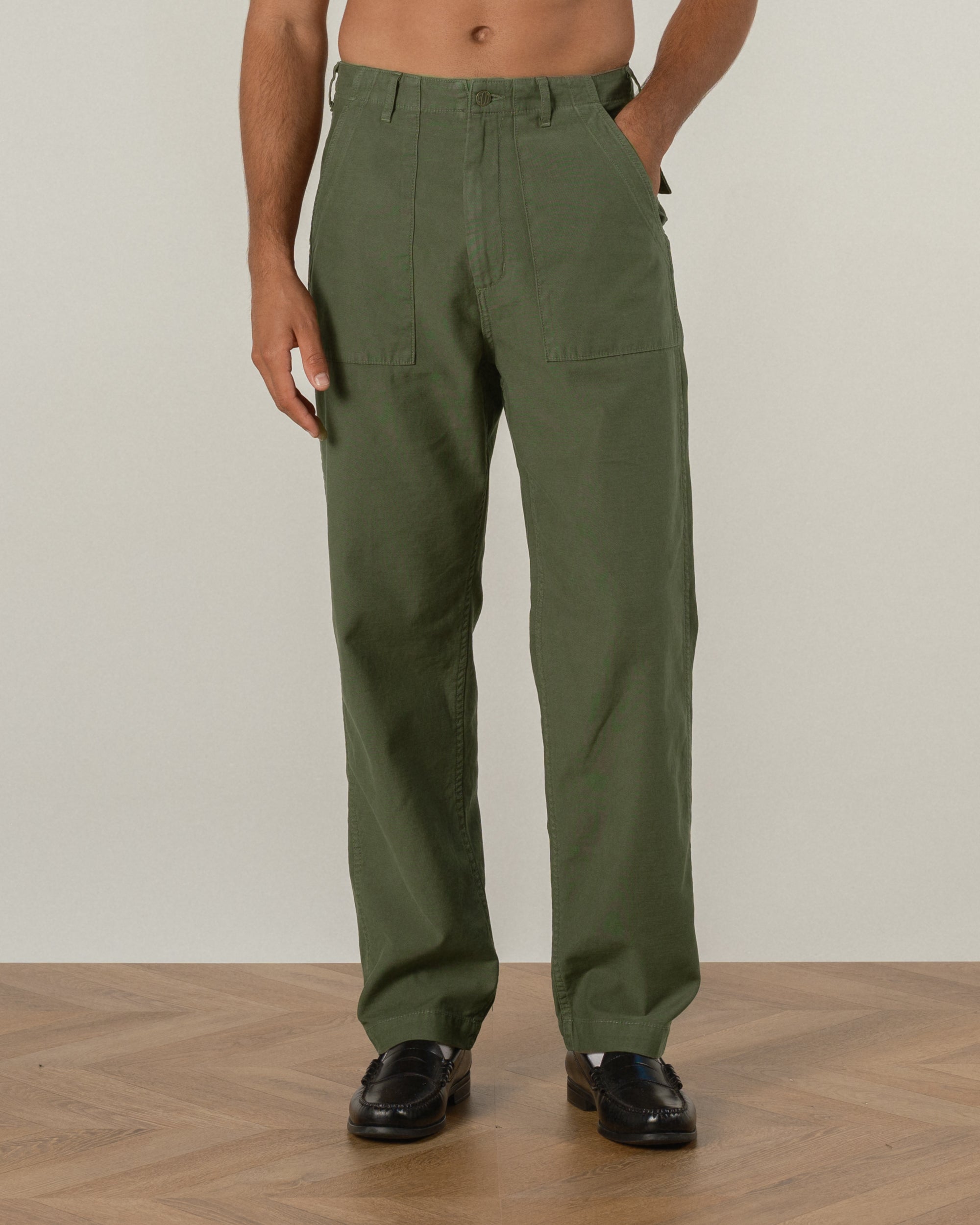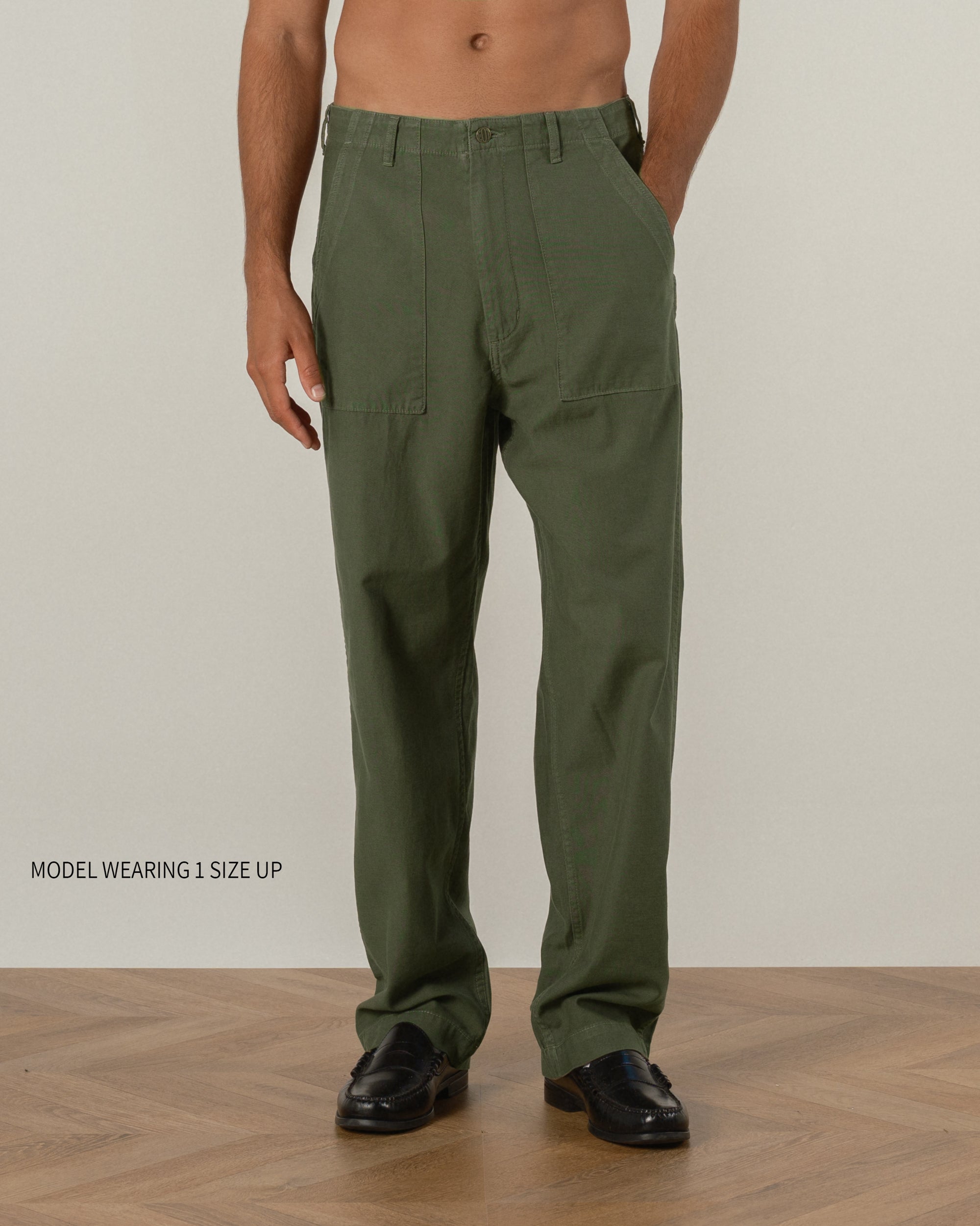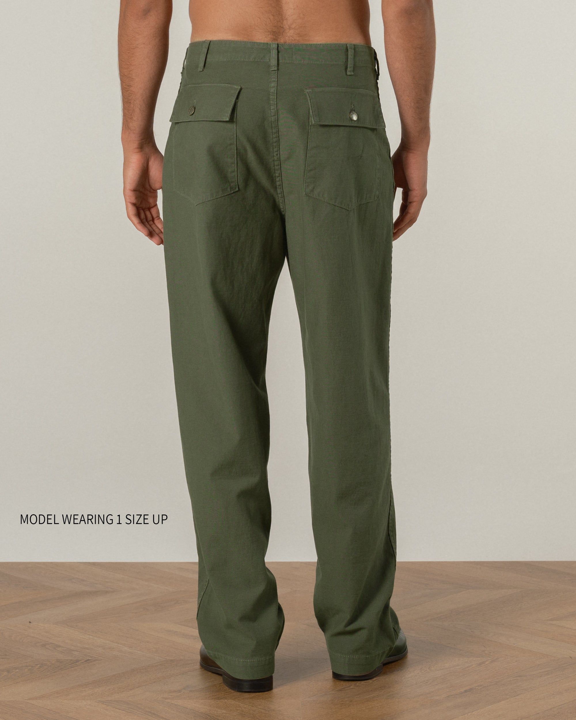 Based on a vintage pair of military pants, these are our alternative to an everyday pair of jeans. Cut with a high rise, wide leg, and from a 100% cotton sateen fabric. Featuring large patch pockets on the front and back, custom EOT hardware, and garment washed for a broken in feel. These fit true to your waist size, size up for a relaxed fit that sits low on your hips.
