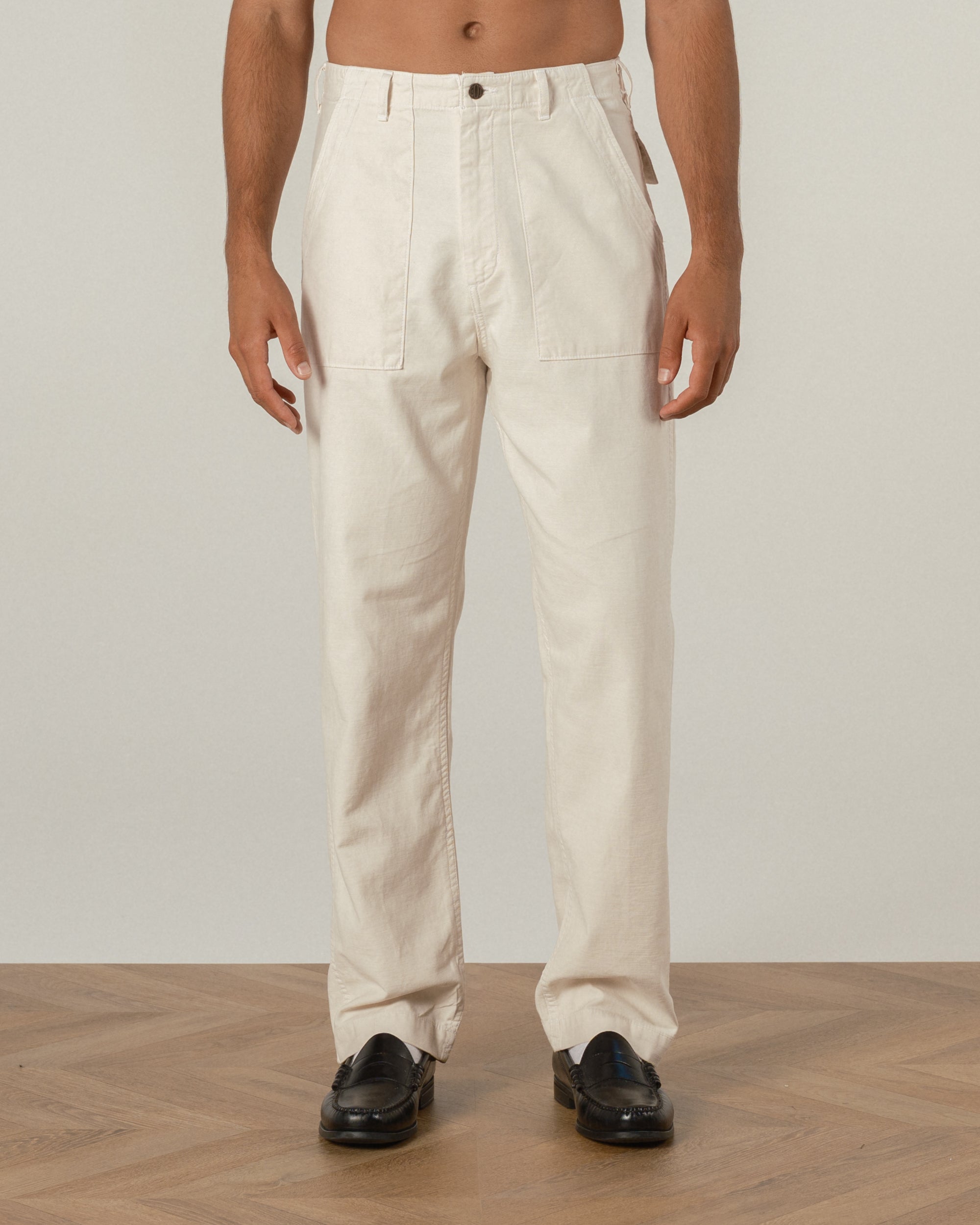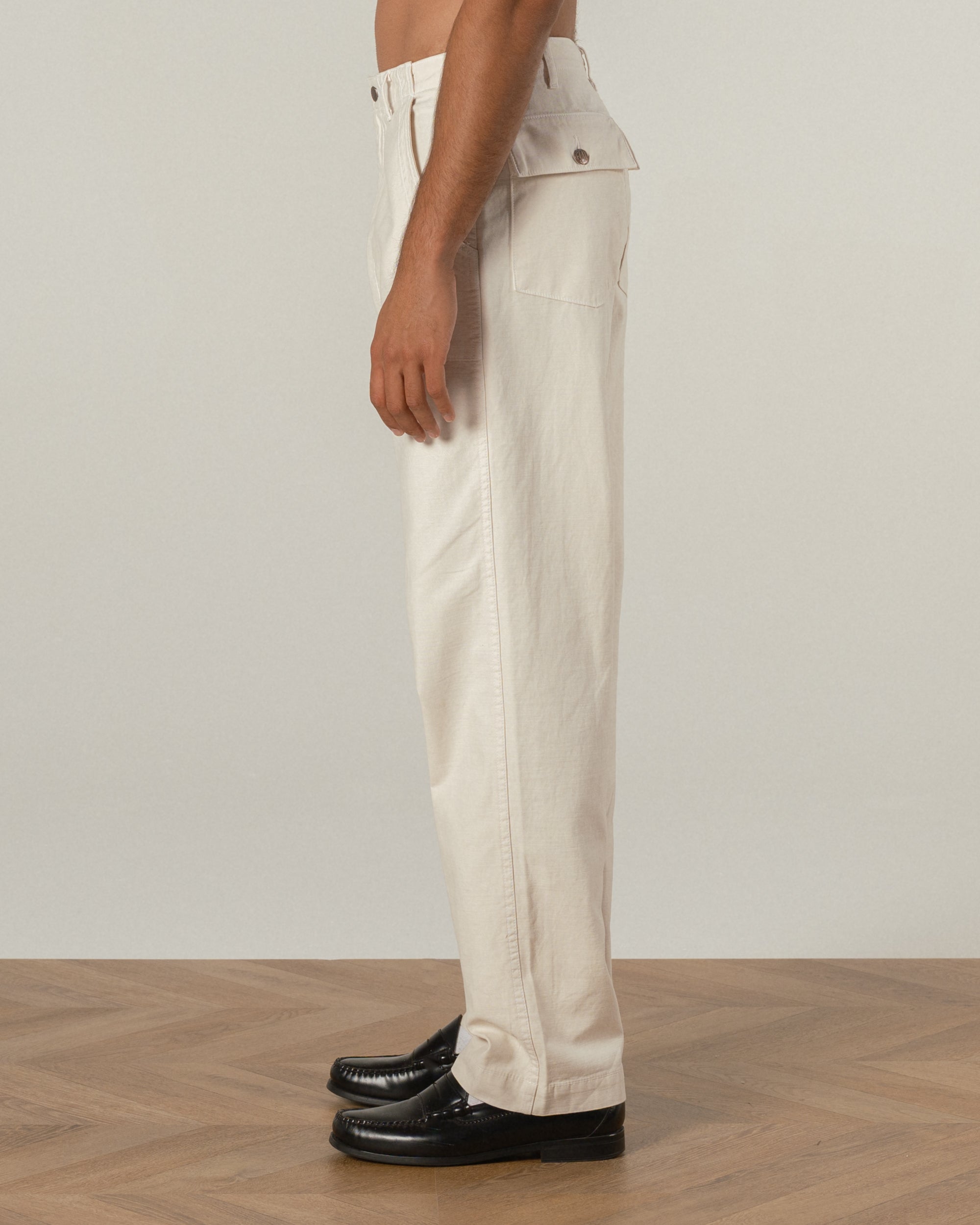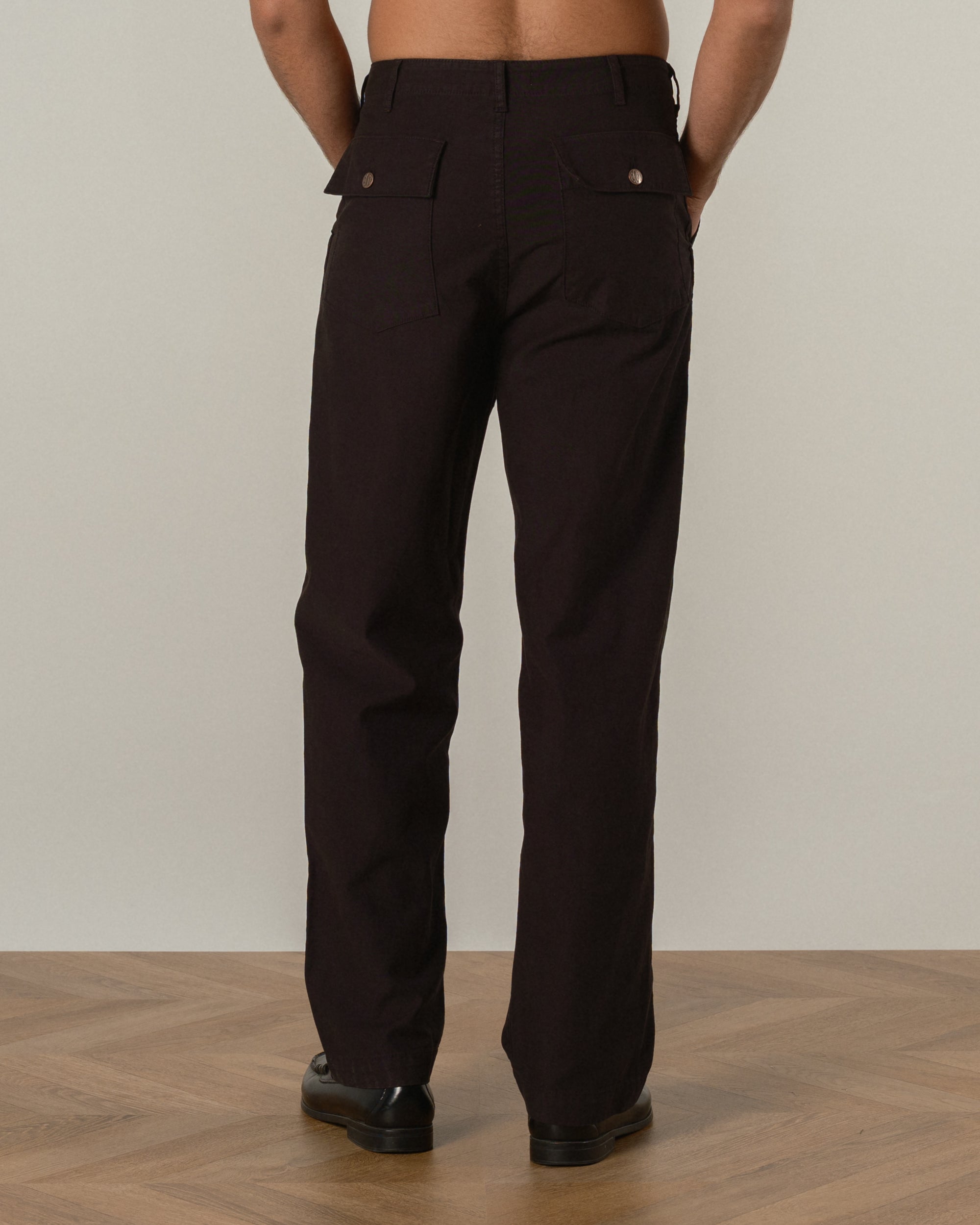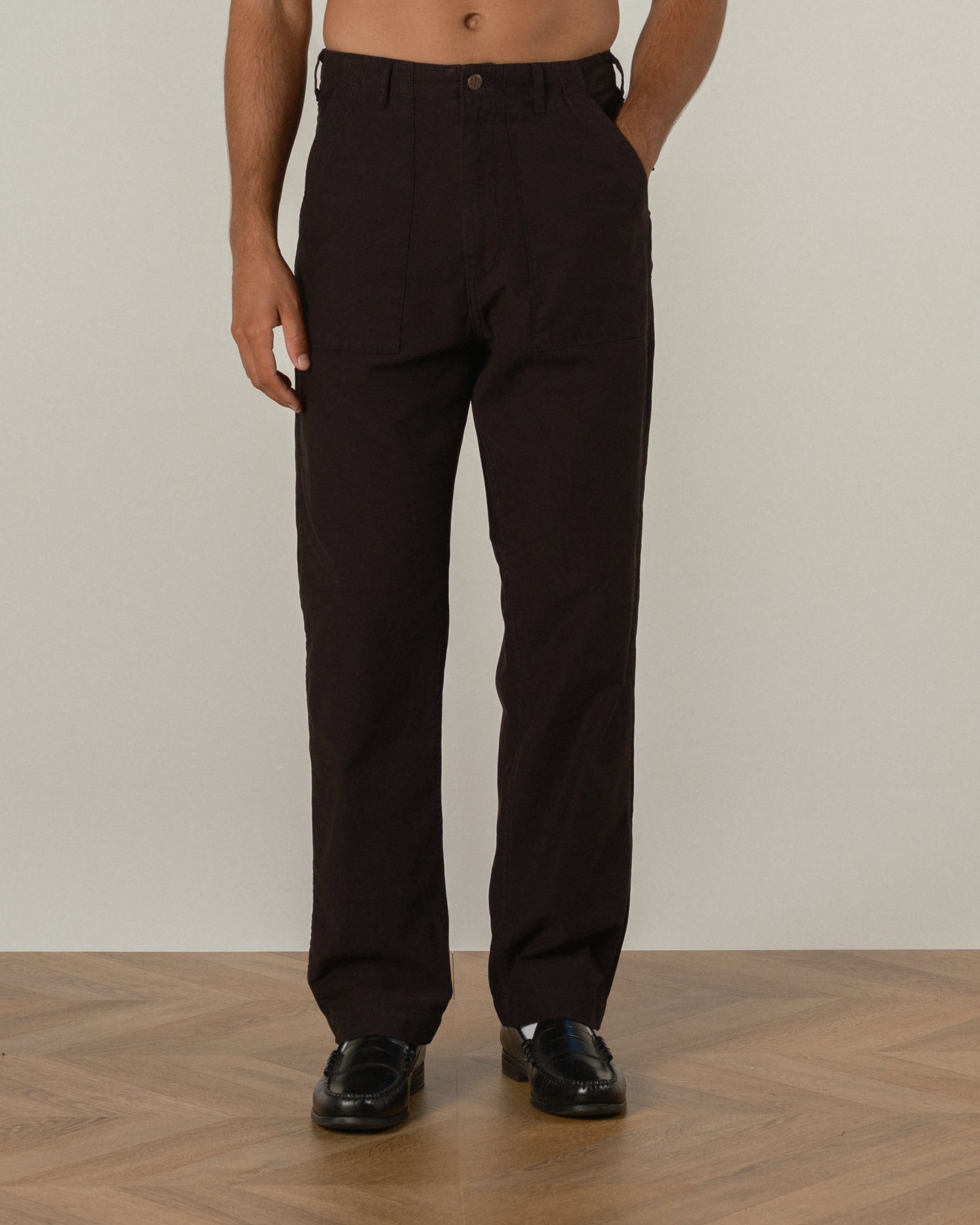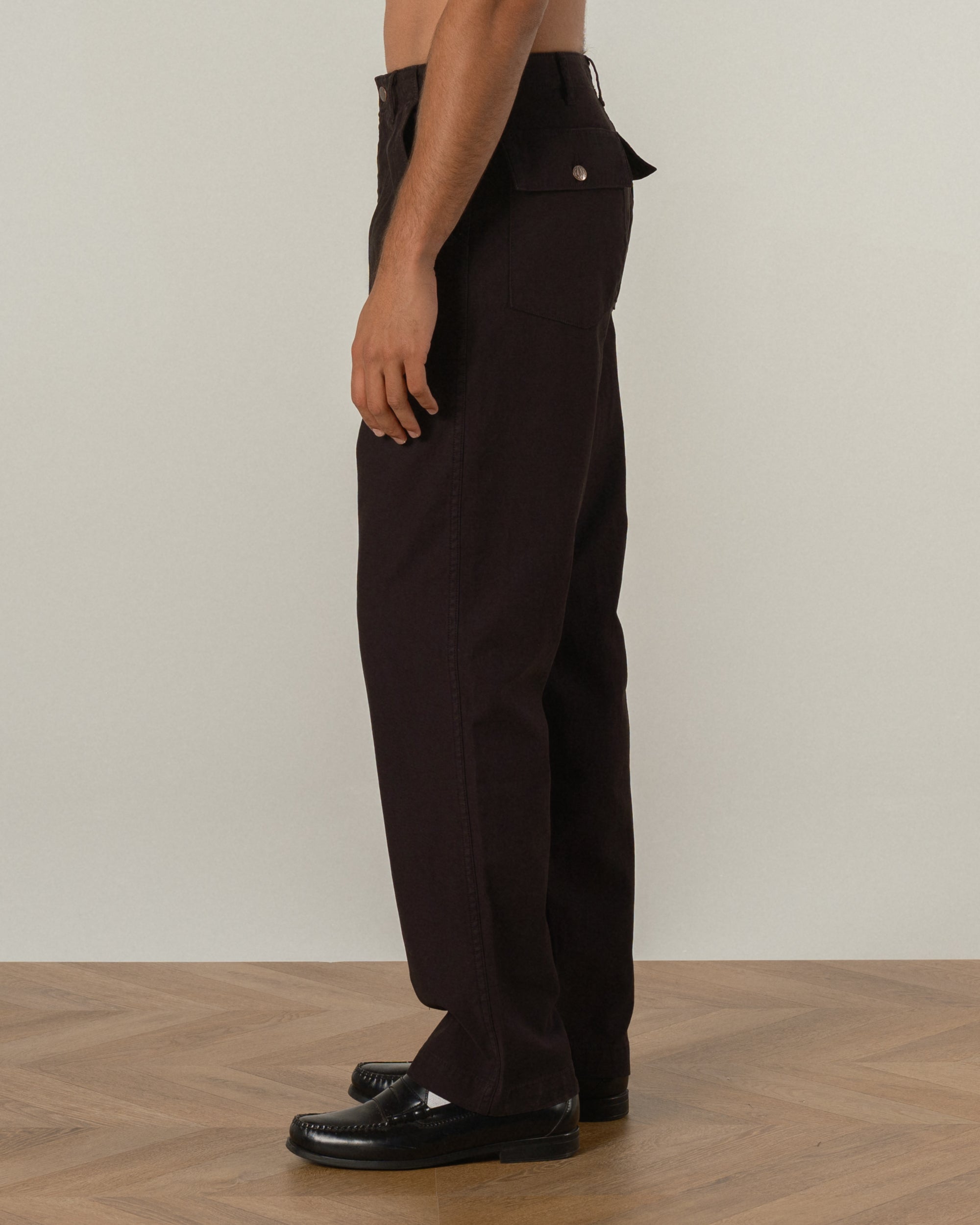 Based on a vintage pair of military pants, these are our alternative to an everyday pair of jeans. Cut with a high rise, wide leg, and from a 100% cotton sateen fabric. Featuring large patch pockets on the front and back, custom EOT hardware, and garment washed for a broken in feel. These fit true to your waist size, size up for a relaxed fit that sits low on your hips.