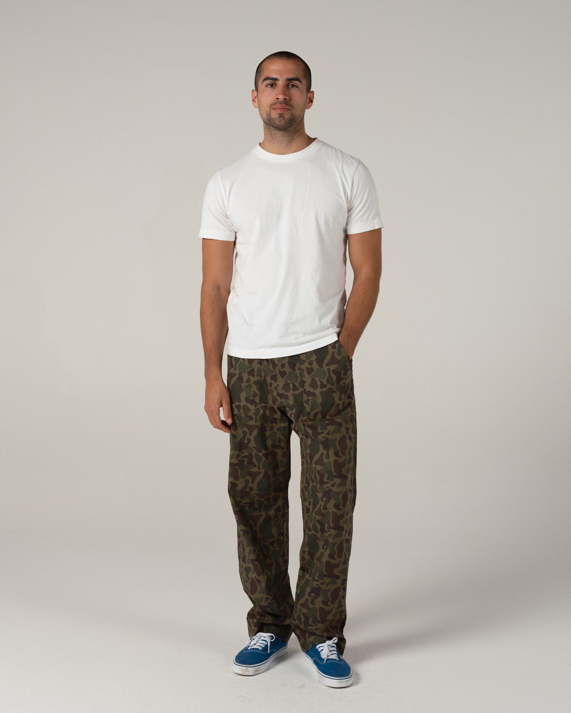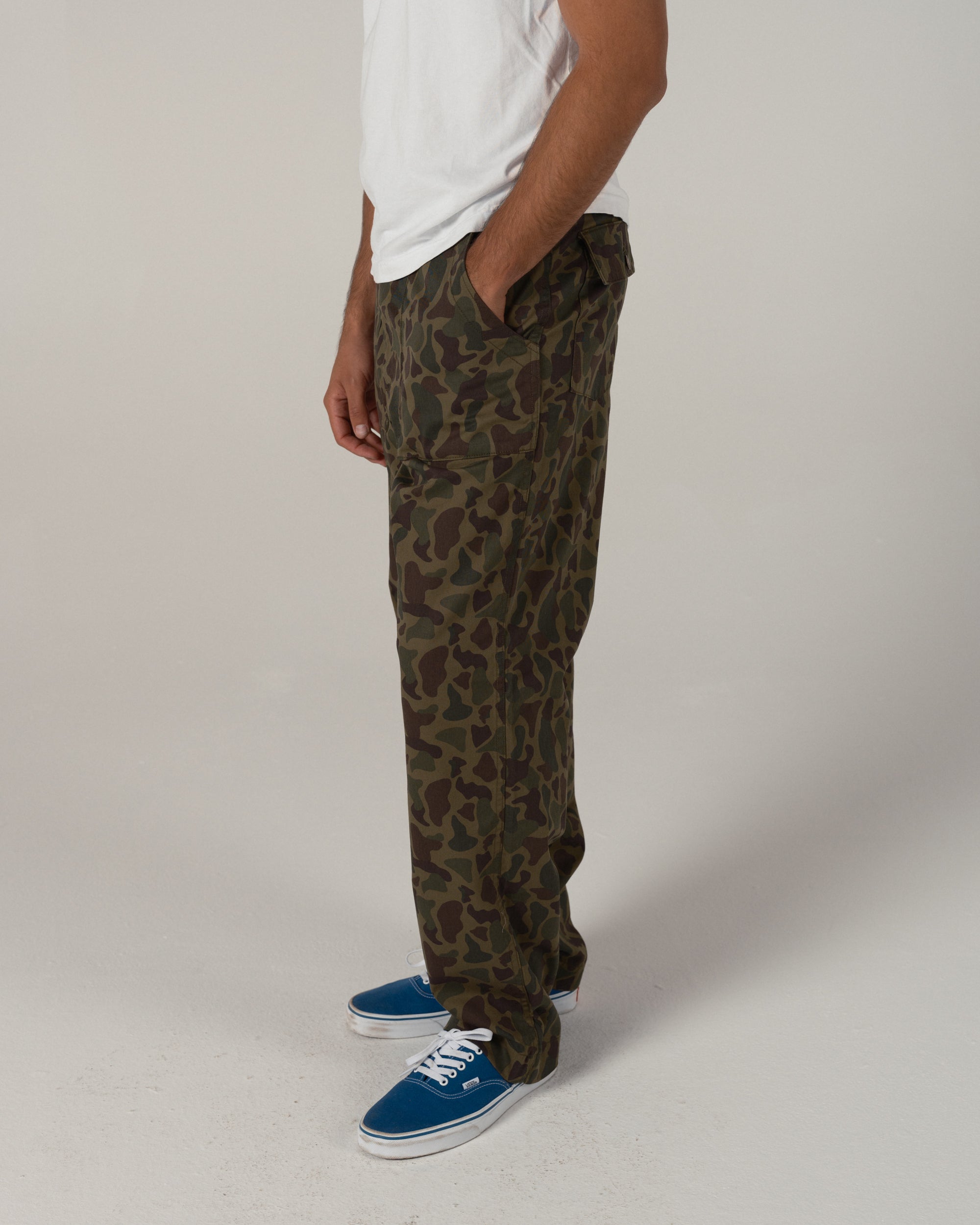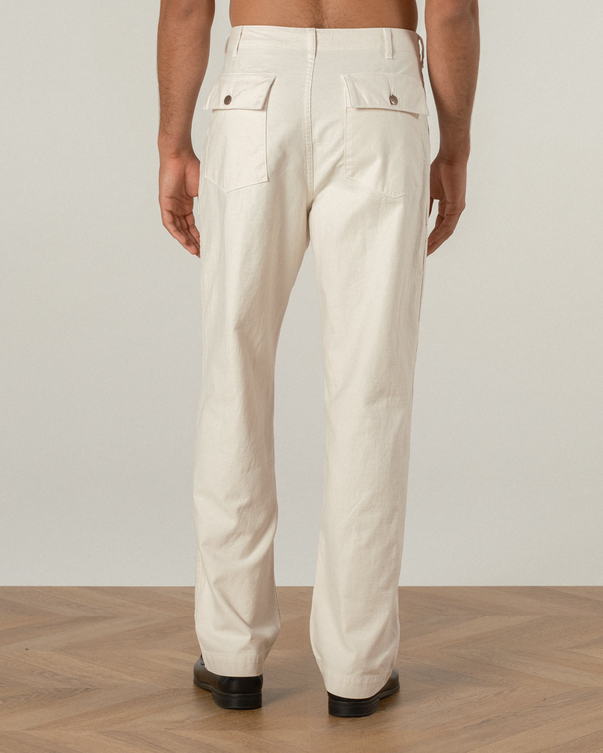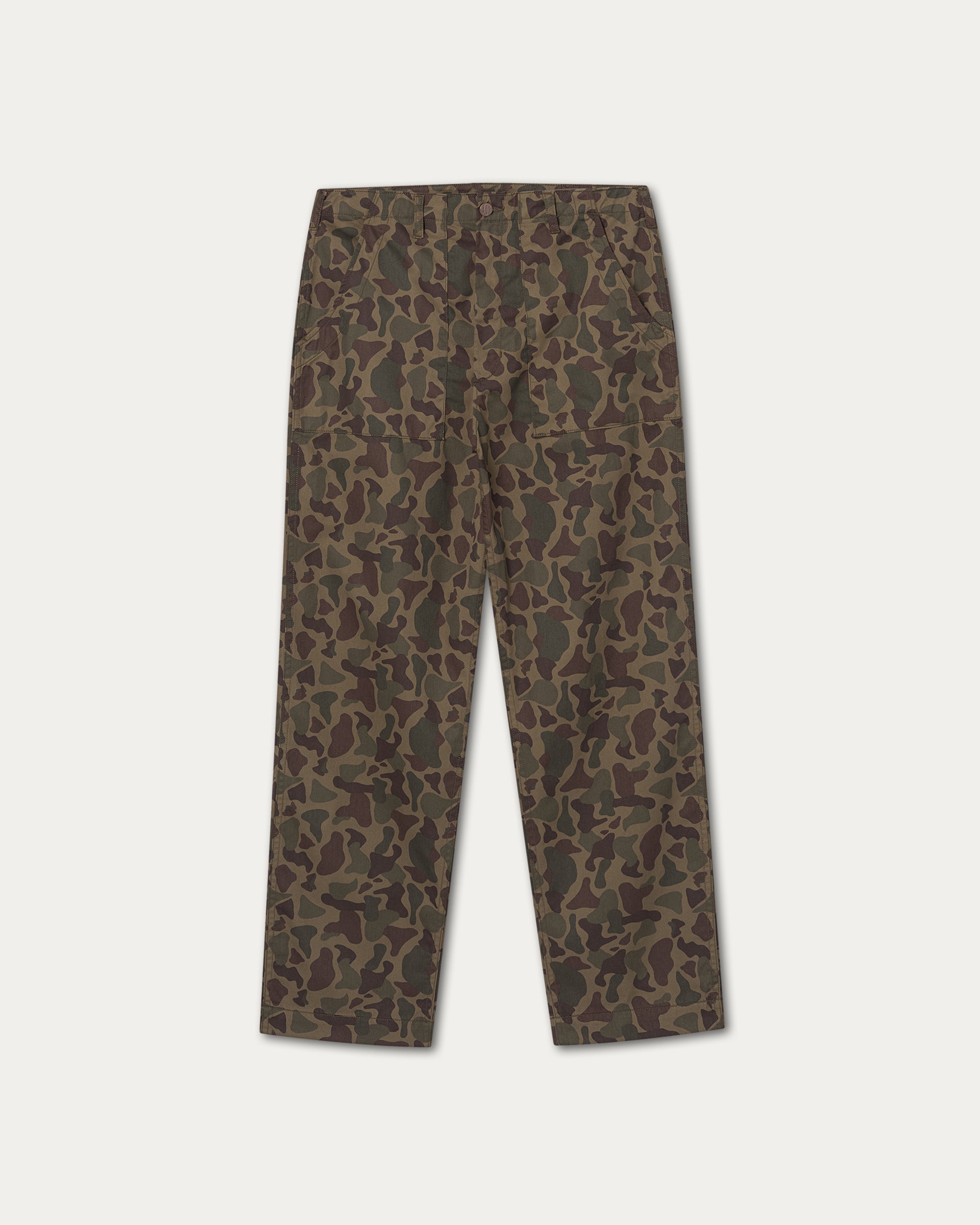 Based on a vintage pair of military pants, these are our alternative to an everyday pair of jeans. Cut with a high rise, wide leg, and from a 100% cotton sateen fabric. Featuring large patch pockets on the front and back, custom EOT hardware, and garment washed for a broken in feel. These fit true to your waist size, size up for a relaxed fit that sits low on your hips.